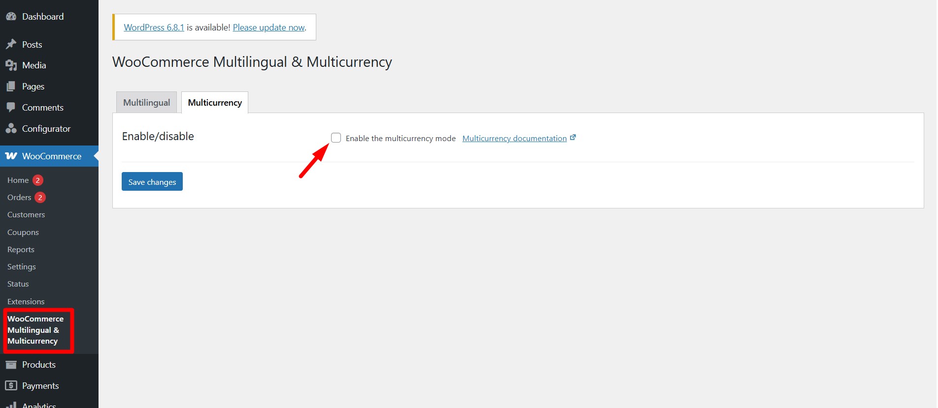 Go to WooCommerce → WooCommerce Multilingual & Multicurrency.