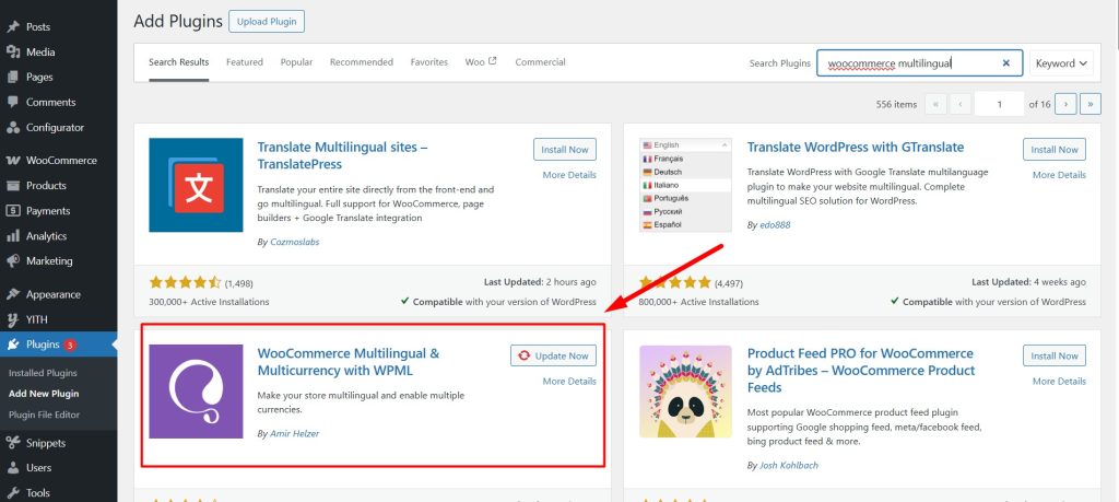 Go to Plugins → Add New → Search for WooCommerce Multilingual & Multicurrency, install and activate it.